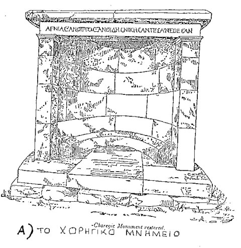 Στο πιο κάτω επίπεδο βρίσκονται τα υπόλοιπα αρχαία κτίσματα: αριστερά είναι οι τοίχοι του ιερού περιβόλου ( Ε ) και ενός κτιρίου αγνώστων στοιχείων ( G ). Στο κέντρο κάτω από τα μάρμαρα που άφησαν οι αρχαιολόγοι όταν κατεδάφισαν την εκκλησία, υπάρχει ένα κτίριο ( D ), πιθανόν ναός του Διονύσου, δύο μεγάλες μαρμάρινες βάσεις (B+C), και το γνωστό μνημείο, το λεγώμενο "βωμός" ( Α ), το οποίο δεν είναι θρησκευτικό, αλλά αντίθετα είναι ένα πολύ ωραίο ημικυκλικό χορηγικό μνημείο του 4ου αιώνα πΧ, χτισμένο από τρεις χορηγούς, τον Αγνία, τον Ξάνθιππο και τον Ξανθίδη, οι οποίοι κέρδισαν στα Διονύσια και έφτιαξαν το μνημείο για να θυμίζουν τη μεγάλη νίκη τους.