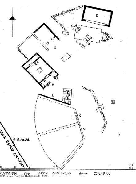 Εκεί υπήρχε θεατρικός χώρος, τον οποίο δημιουργούσε η κλίση του λόφου, όπου και κάθονταν οι θεατές στα αρχαία Διονύσια. Το θέατρο αυτό βρίσκεται μπροστά και δεξιά μας όπως μπαίνουμε στο χώρο. Η ορχήστρα ( Ο )είχε ένα ασυνήθιστο τραπεζοειδές σχήμα. Οι πέτρες της σκηνής στέκονται ακόμα στη σειρά στην πίσω πλευρά της ορχήστρας, αλλά οι 6 πολυθρόνες της προεδρίας ( Κ ) είναι σκορπισμένες εδώ κι εκεί. Δίπλα στην ορχήστρα αριστερά διακρίνεται μία μεγάλη βάση φτιαγμένη από μεγάλες και μικρές μαρμάρινες πέτρες. Εδώ πιθανόν να ήταν ο βωμός του Διονύσου ή του Απόλλωνος ( Ι ), διότι λίγο πιο αριστερά βρίσκονται τα θεμέλια του ναού του Απόλλωνος ( Η ), που περιλαμβάνει πολλές βάσεις για αναθήματα, το κατώφλι που λέει "ΙΚΑΡΙΩΝΤΟ ΠΥΘΙΟΝ" και η βάση του λατρευτικού αγάλματος (το οποίο δεν βρέθηκε ποτέ).